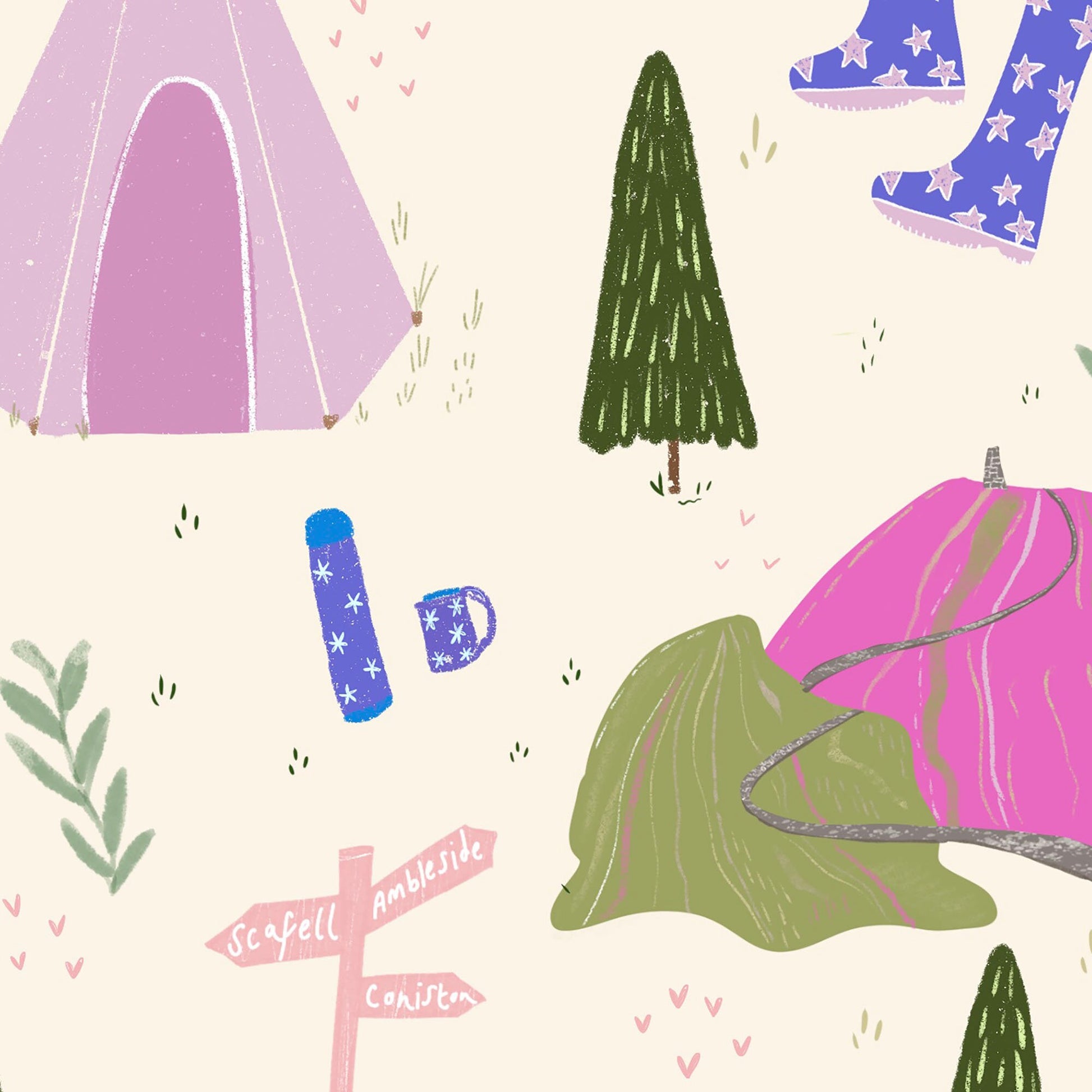 This artwork is called Cumbrian Adventures. This piece was inspired by the lovely Lake District National Park and a love for camping. An illustrative collection of everything you might need on a camping trip from tents, wellies and a flask to the beautiful hills and trails you might find along the way. Given the mix of colours, it would be a lovely addition to any gallery wall or as a gift for someone that enjoys camping and the great outdoors.