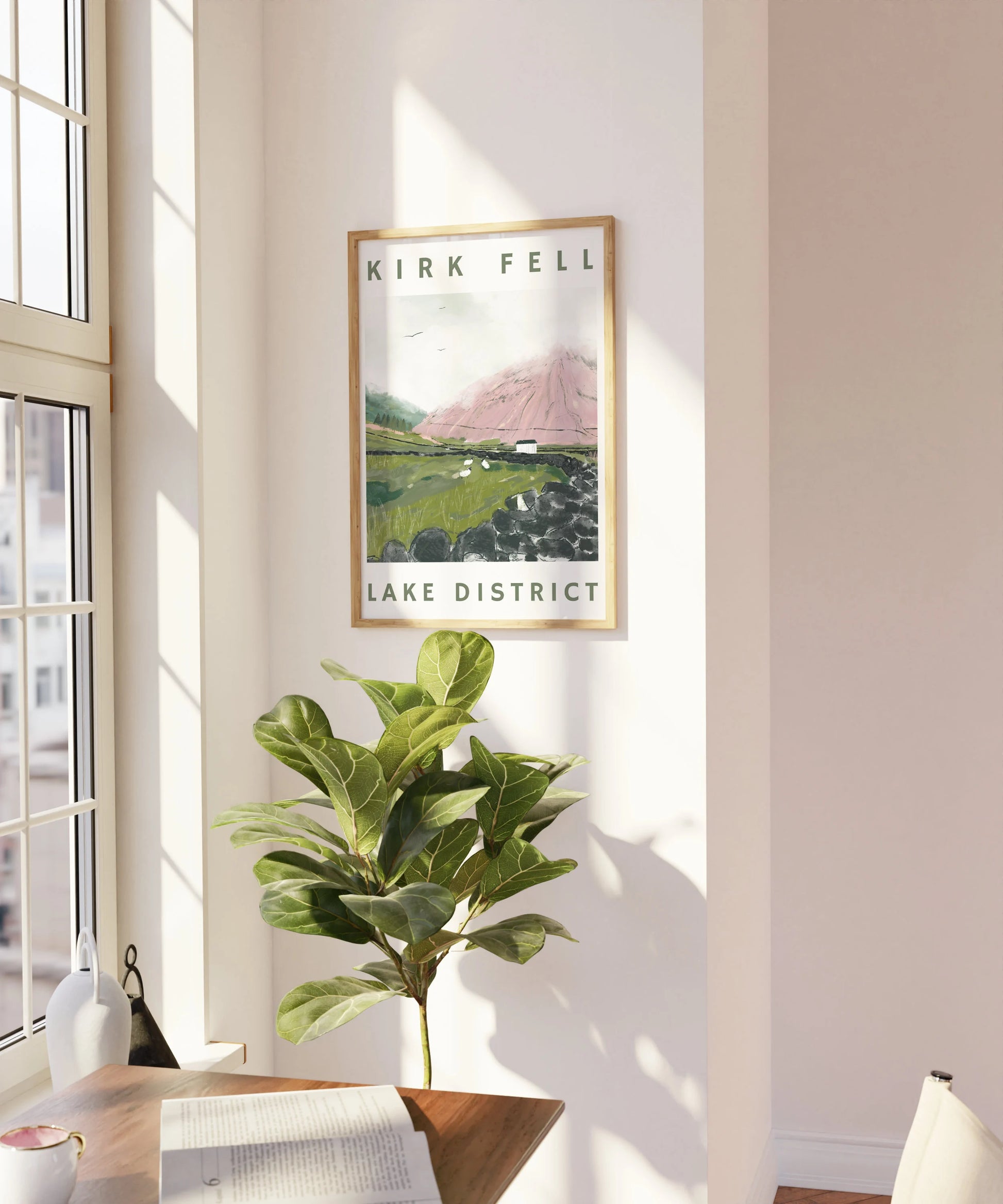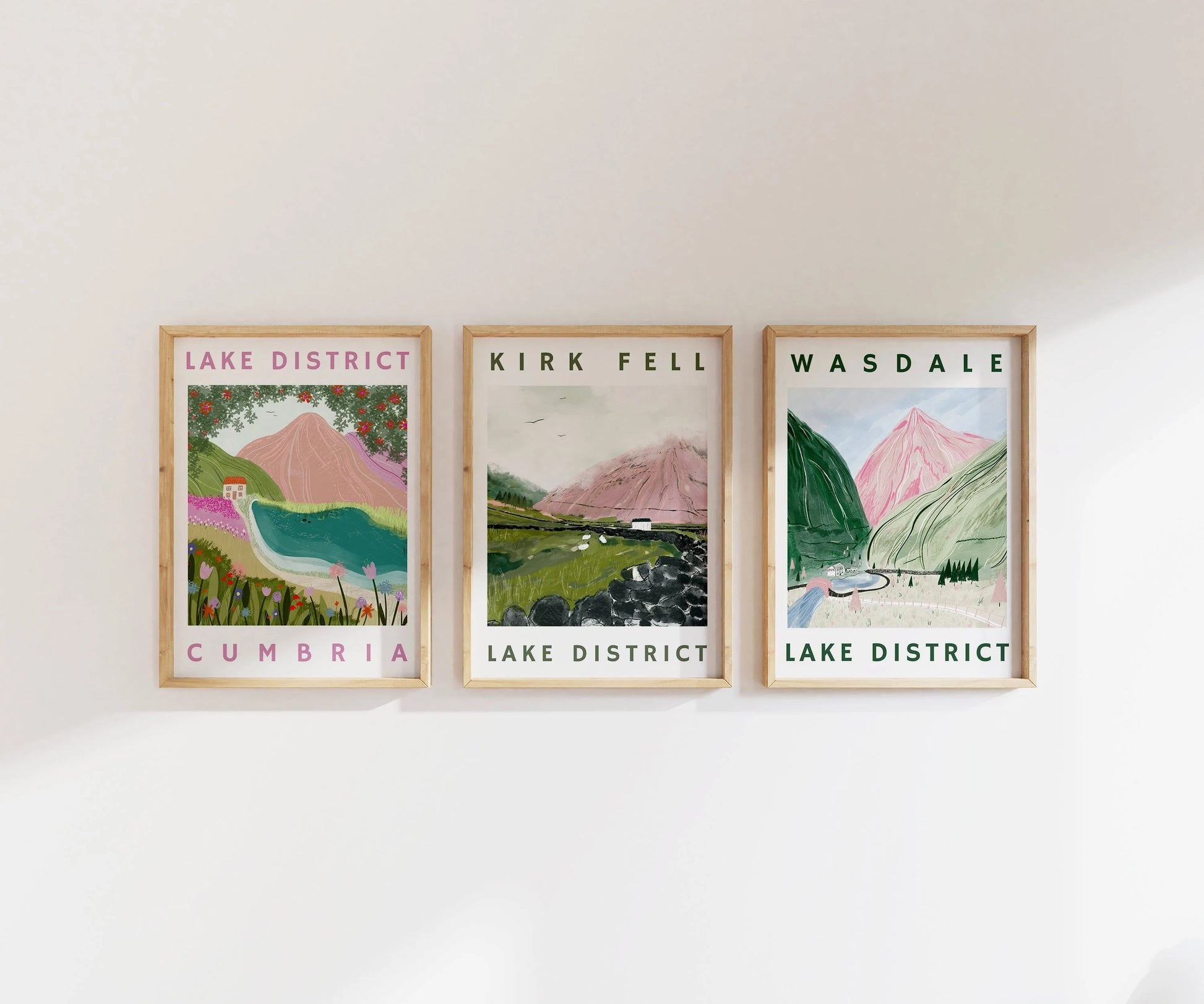Inspired by the beautiful fells situated in Wasdale, The Lake District National Park. There's nothing quite like seeing the hilly horizon of Wasdale slowly getting covered by the clouds above. Cloudy weather is fairly common in Cumbria and I wanted to include it within the illustration. Also included within this digitally drawn illustration we have Kirk Fell, hiding under its cloudy cloak and surrounded by fields of sheep, separated by dry stone walls. There'll never be a day that I am not awestruck by the beauty of the Lake District and this piece has been inspired by just that. As part of my illustrative style, I like to include colour that shouldn't necessarily be there. Hence, you will find mountains drawn in shades of pinks, purples and more! I love the textures of the great outdoors and as part of my process, I strive to depict this within my drawings.