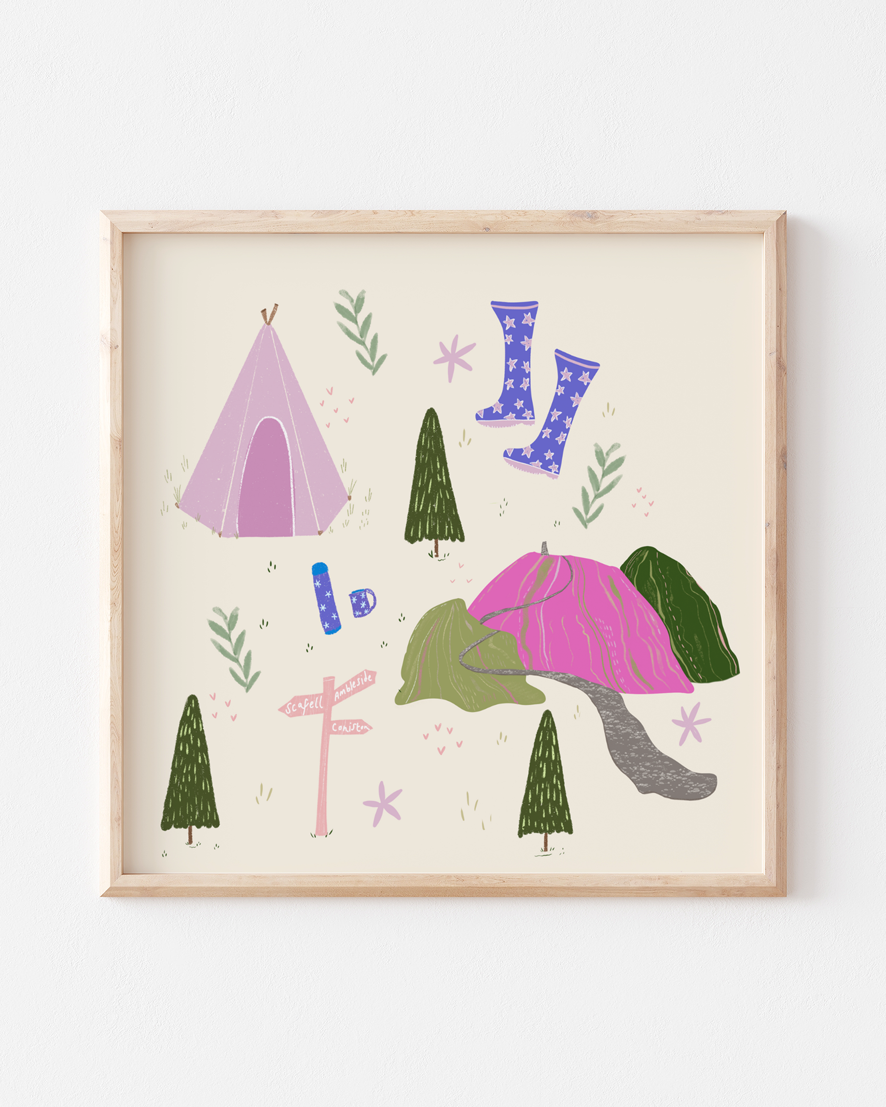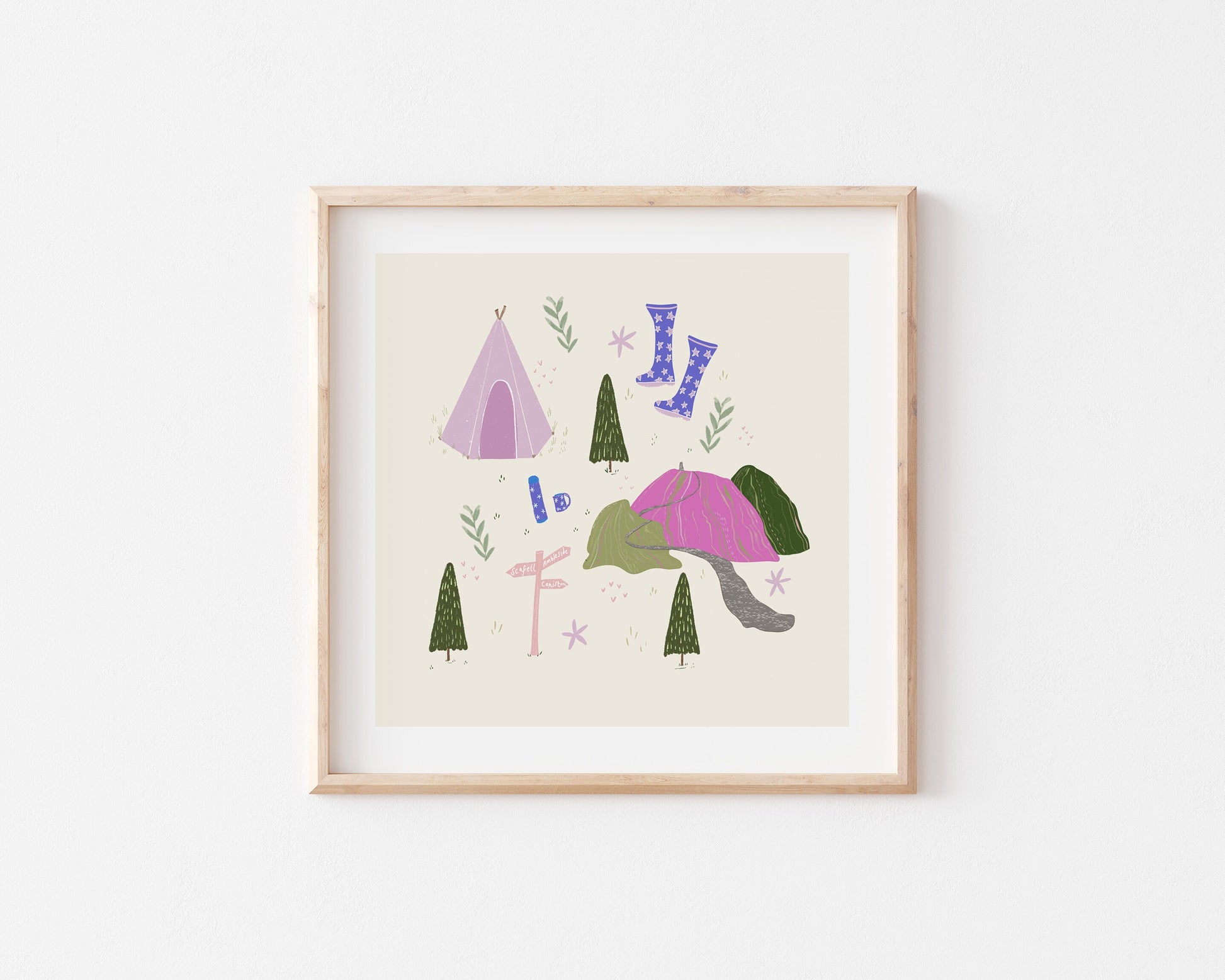 Given it's mix of colours it would be a lovely addition to any gallery wall or as a gift for someone that enjoys camping and the great outdoors. This print has been drawn digitally and printed onto high quality fine art 350gsm paper. Dimensions: This print is available in 25x25cm 30x30cm please select your preferred option.