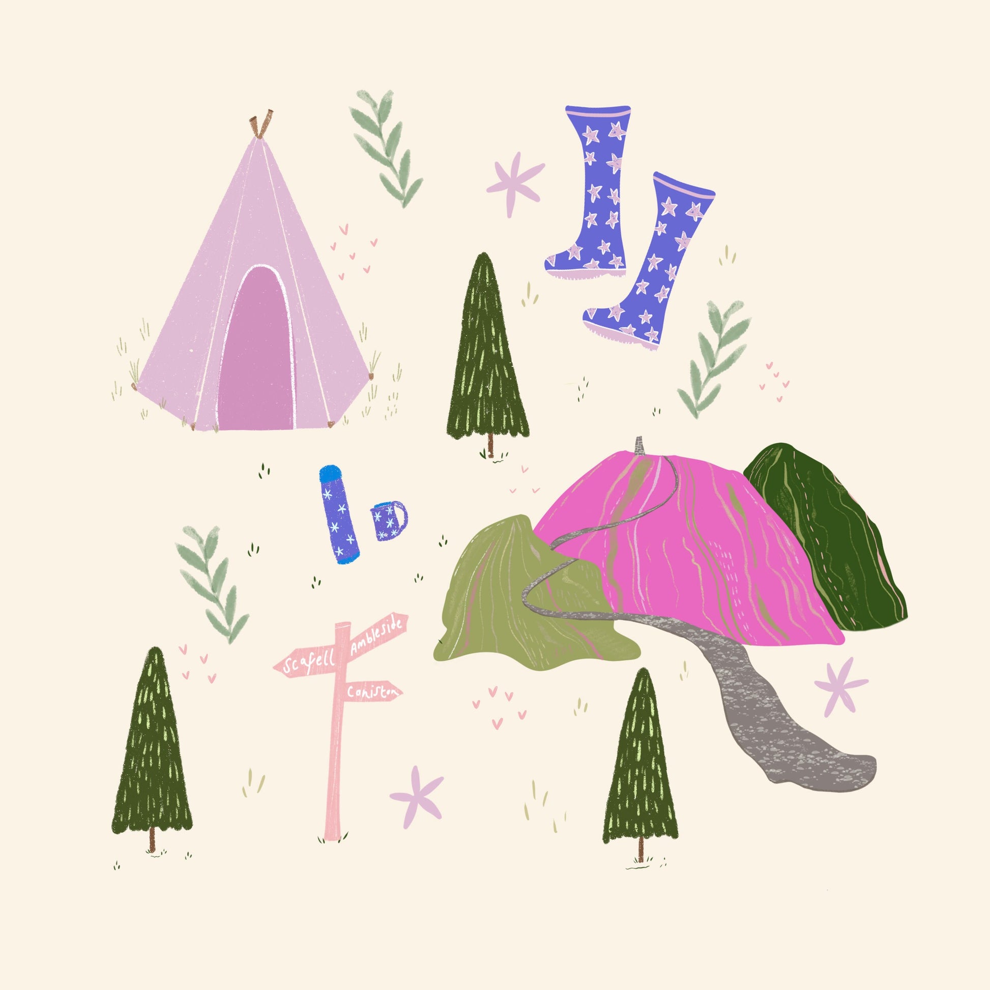 This artwork is called Cute and Cumbrian Camping essentials. This piece was inspired by the picturesque Lake District National Park and a love for camping. An illustrative collection of everything you might need on a camping trip. From tents, wellies and a flask, to the beautiful hills and trails you might find along the way.