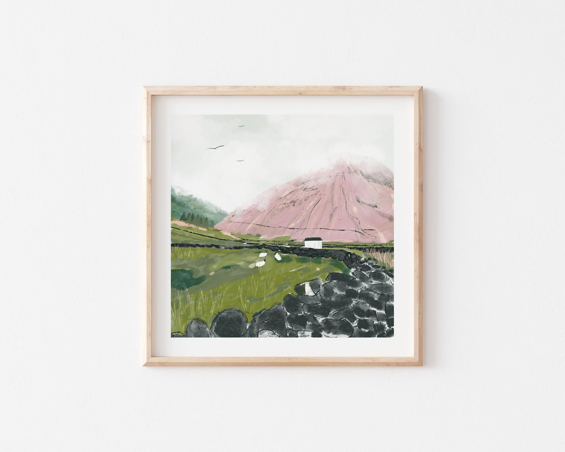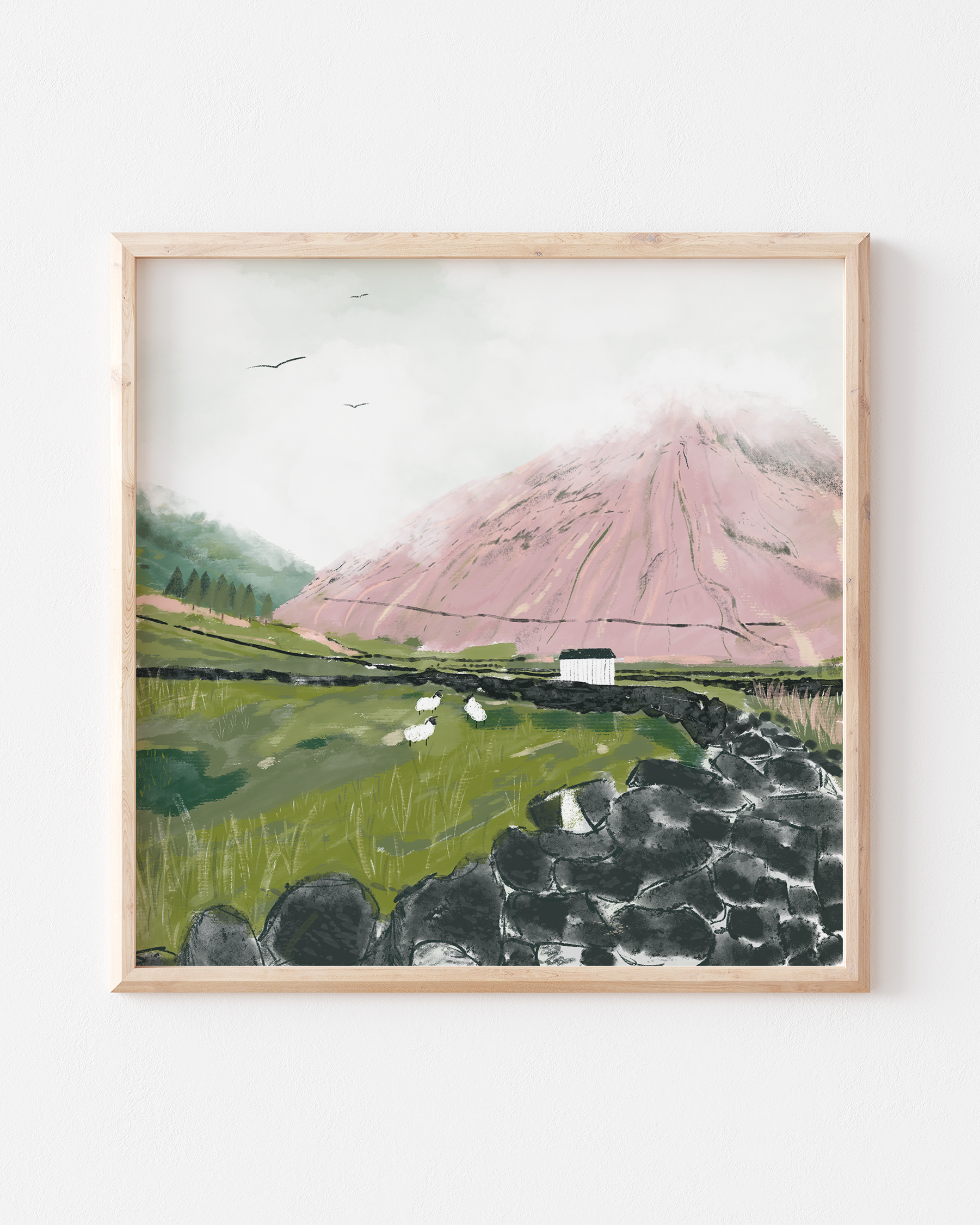 This artwork is called "Where the mountains meet the clouds." Inspired by the beautiful fells situated in Wasdale, The Lake District National Park. There's nothing quite like seeing the hilly horizon of Wasdale slowly getting covered by the clouds above. Cloudy weather is fairly common in Cumbria and I wanted to include it within the illustration. Included within this digitally drawn illustration we have Kirk Fell, hiding under it's cloudy cloak and surrounded by fields of sheep, separated by dry stone walls.